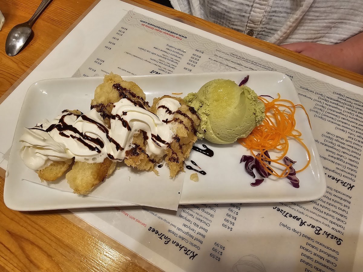 Spicy salmon, tempura bits roll, tuna roll, and avocado roll.